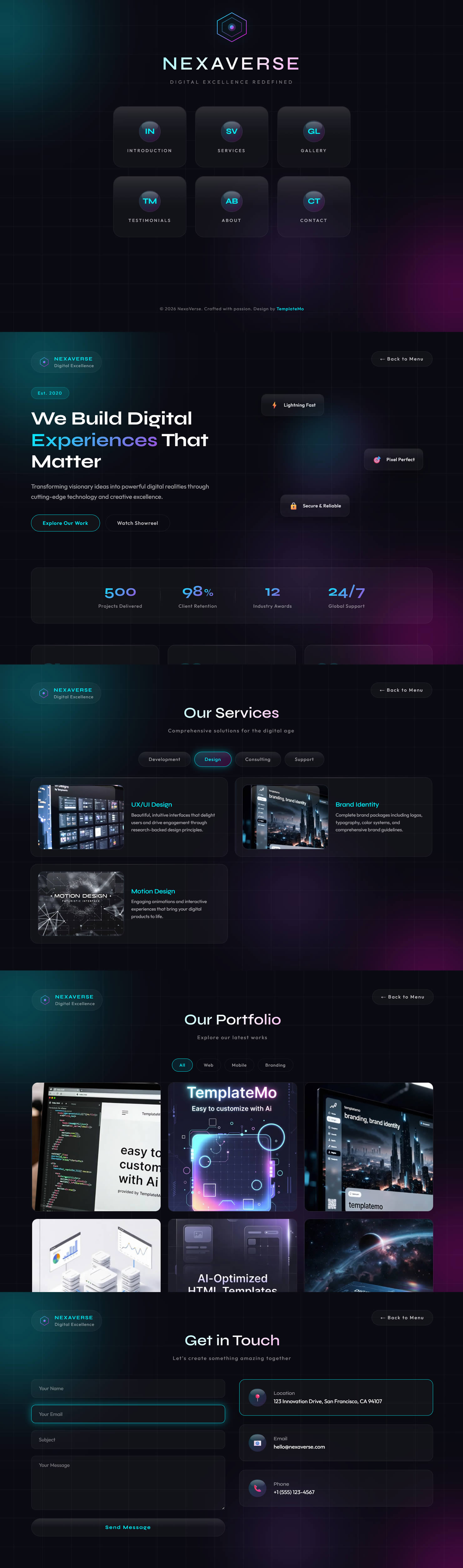 NexaVerse is a stunning dark glassmorphism template crafted for digital agencies, tech startups, and creative professionals who want to make a bold impression. Featuring a sleek single-page design with smooth fade transitions, the template showcases glossy badge-style navigation instead of traditional icons, ambient floating orbs, and a subtle grid overlay that adds depth without distraction. Built with modern CSS techniques including backdrop-filter blur effects, gradient glows, and carefully crafted hover animations, NexaVerse delivers a premium aesthetic that stands out from generic templates.